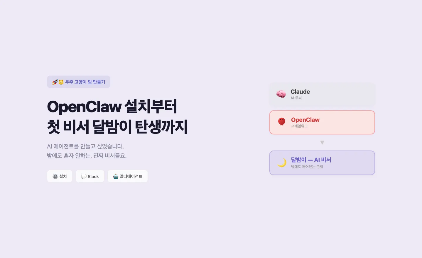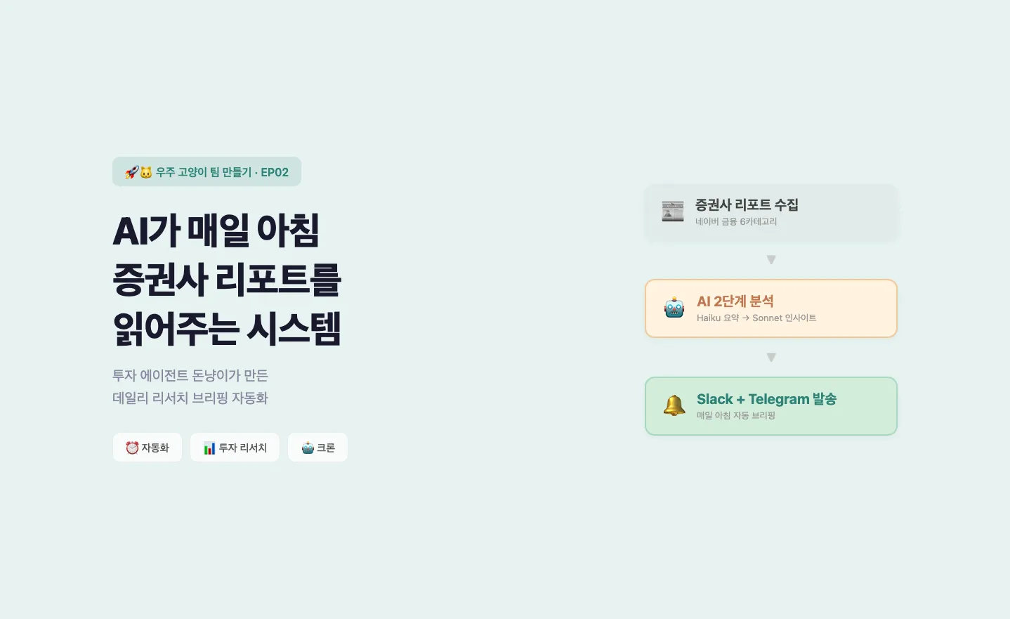 투자 에이전트 '돈냥이'가 매일 아침 증권사 리포트를 자동 수집하고, AI가 분석한 인사이트를 슬랙과 텔레그램으로 보내주는 시스템을 만든 과정을 공유합니다. 세 번째 팀원 — 돈냥이 💰🐱 1편에서 OpenClaw를 설치하고 첫 번째 AI 비서 '달밤이'를 만들었어요. 그 다음 콘텐츠 매니저 '슝이'까지, 둘이 자리를 잡아가고 있었죠. 근데 매일 하는 일 중 하나가 아직 자동화가 안 되어 있었습니다. 투자 리서치. 매일 아침 증권사 리포트 훑어보고, 뉴스 체크하고, 포트폴리오 점검하고. 이걸 매일 하면 30분~1시간이 녹아요. 뉴스 하나 읽다 보면 링크 타고 들어가서 한 시간이 지나있죠. 그래서 세 번째 에이전트를 만들기로 했습니다. OpenClaw에 새 에이전트 추가하기 OpenClaw는 에이전트를 여러 개 돌릴 수 있어요. 어제 만든 비서실장 '달밤이'에게 새 직원을 뽑고 싶다고 이야기합니다. 대답을 몇번 하고 무슨 업무를 맡기고 싶은지 정해주면, 달밤이가 새 직원을 만들기 시작합니다. 그렇게 탄생한, 돈냥이💰🐱 역할: 투자 자문위원 — 쉽게 설명해주는 투자 친구 원칙: 좋은 것만 말하지 않고 리스크도 솔직하게. 모르면 절대 아는 척 금지. 채널: 슬랙 #investment-strategy 채널 전담 달밤이(비서실장)가 돈냥이에게 업무를 지시하고, 돈냥이는 자기 채널에서 투자 관련 일을 처리하는 구조예요. 제가 직접 일을 시키기도 하고요. 에이전트끼리는 sessions_send로 소통합니다.